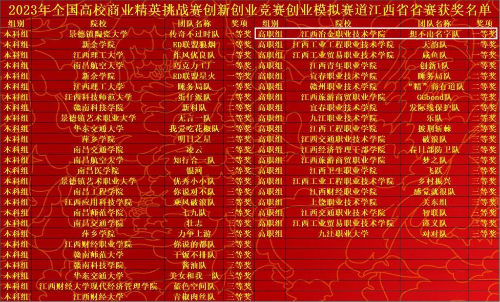 2023年7月2日,由江西省教育厅主办、江西科技师范大学承办的“2023年全国高校商业精英挑战赛创新创业竞赛创业模拟赛道江西省赛”在南昌举行。商务管理学院参赛队在比赛中荣获高职组一等奖。该队由吕汇青、陆雅恬老师带队,参赛学生分别为刘梦芸、江小文、冯朝阳、邹娟、曾秋瑀。