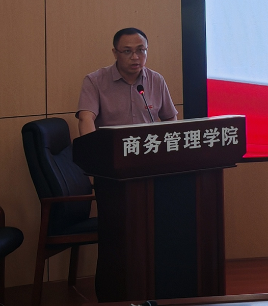 郭斌讲话。他指出,教学改革与人才培养是分院发展的核心任务。在新经济形态和产业升级的背景下,分院要紧密结合行业需求,以学生发展为中心,进一步完善课程体系,强化实践教学,培养高素质、应用型的商务管理人才。