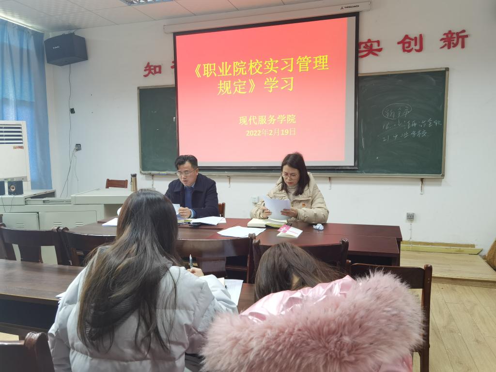 【现代服务学院李思晨报道】为规范和加强现代服务学院学生实习工作,确保实习工作安全、稳定、有效开展,2月19日上午,现代服务学院组织全体教师在老三教503室集中学习《职业学校学生实习管理规定》,会议由现代服务学院阮和平院长主持。