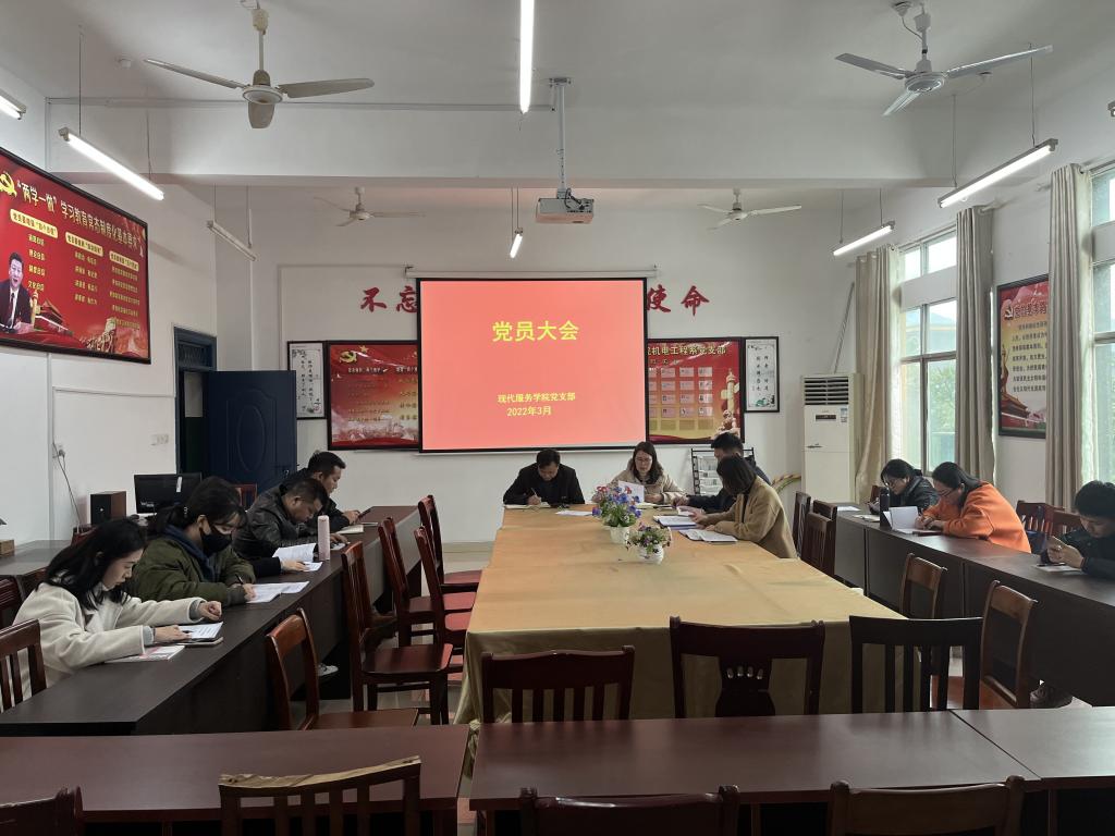 【现代服务学院廖斐报道】3月3日,现代服务学院党支部在党员活动室召开党员大会。大会由支部副书记欧阳小缨主持,支部全体党员参加。