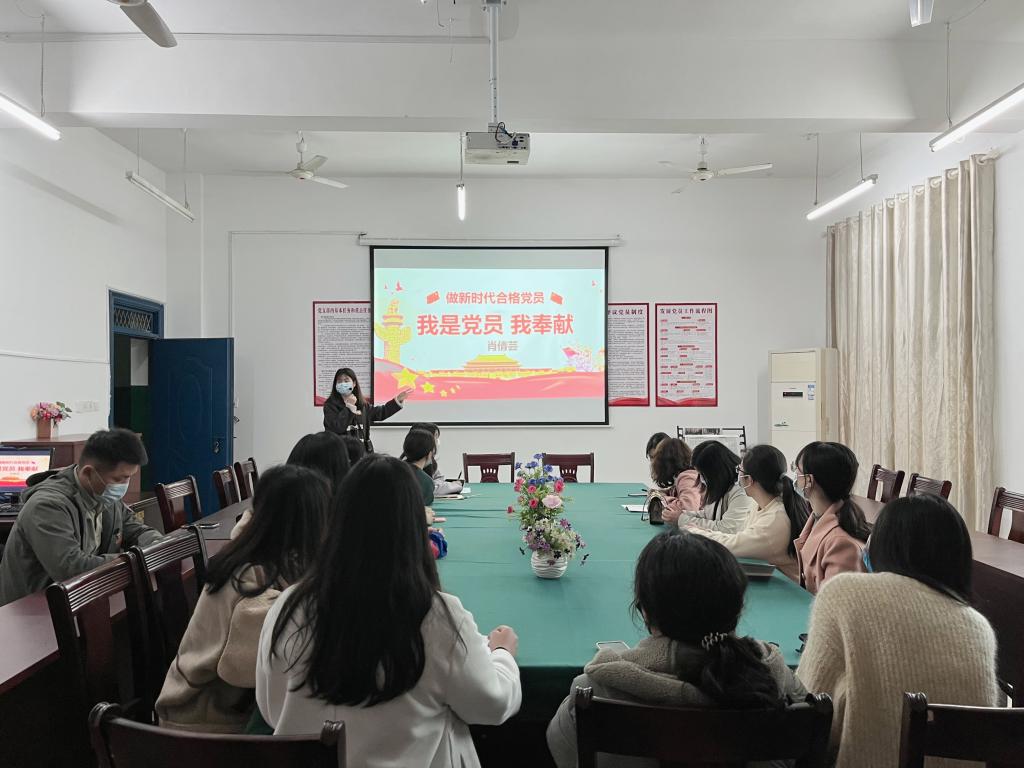 【现代服务学院廖斐报道】 3月31日,现代服务学院党支部在党员活动室开展了以“我是党员 我奉献——做新时代合格党员”为题的党课,党课由肖倩芸老师主讲,全体党员教师参加。