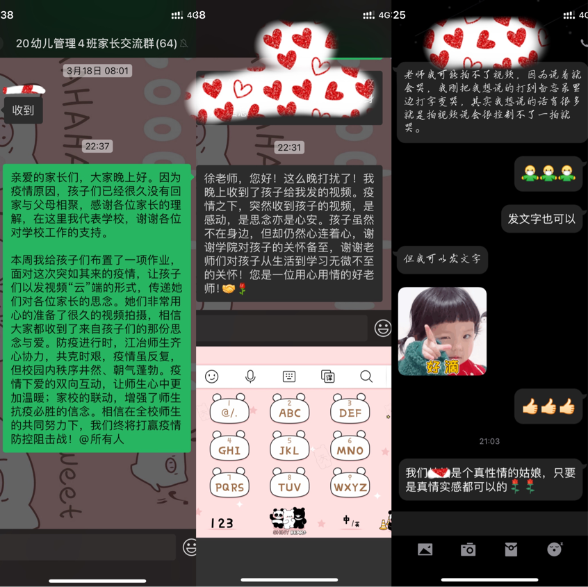 许久未见父母的她们,精心制作了一段段“爱心视频”,与父母隔空“视频”表牵挂。一段视频,一段语音,一段通话,都呈现出一则则温情的故事,一段段感人至深的画面。家长们收到孩子一段段暖心视频后热泪盈眶,感动至极。在与辅导员徐卉的通话过程中表示:“疫情之下,突然收到孩子的视频,是感动,是思念亦是心安。孩子虽然不在身边,但却仍然心连着心,谢谢学院对孩子的关怀备至,谢谢老师们对孩子从生活到学习无微不至的关怀。”