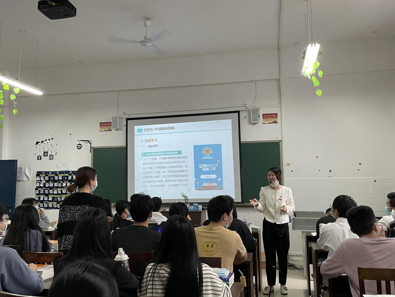 江敏老师以《H5场景化营销》为题,从什么是H5、H5的设计流程、营销时的注意事项、经典H5案例分享这四大模块进行深入分析,用丰富的案例牢牢抓住学生的心;同时充分发挥网络教学平台的功能,运用信息化教学手段让学生进行课前预习和课中互动,课堂上有效运用分组讨论等多样化的教学方法,引导学生自主思考,积极发言,真正践行了以学生为主体的授课理念。