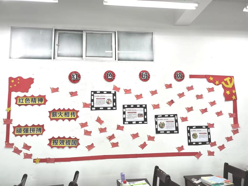 此次活动以“沐红色环创 感时代荣光”为主题,根据班级的特点,师生精心策划,查找革命英雄资料、剪纸刻字、制作图片,短短一周时间,一块块个性鲜明、主题突出的红色班级文化墙跃然呈现在教室中。班级红色文化墙内容丰富,融知识性、教育性、艺术性于一体。革命英雄的照片、事迹、手抄报、学生书画作品等,体现了班级特色,又给学生提供了自我展示的平台。