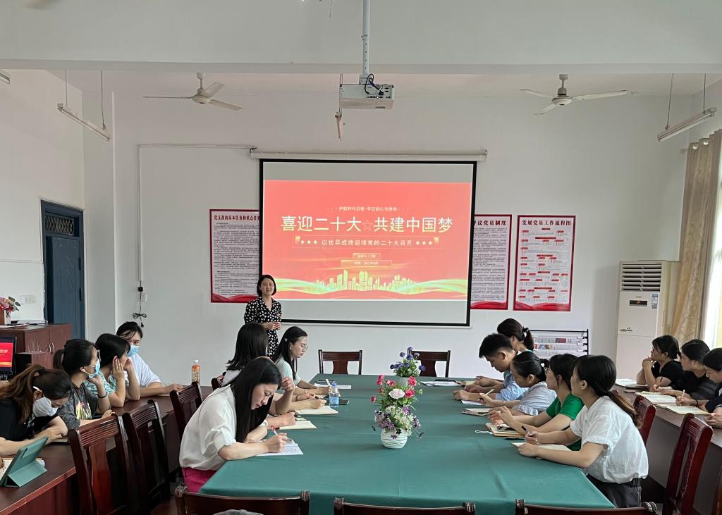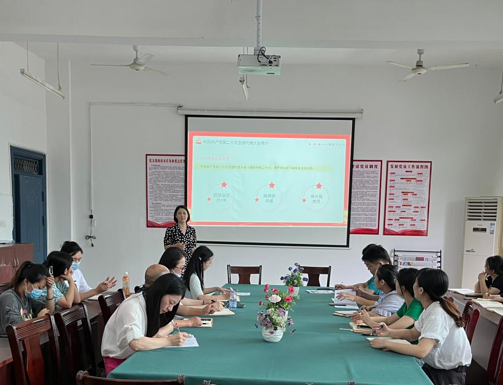 【现代服务学院廖斐报道】2022年6月21日,在老三教党员活动室,现代服务学院党支部开展了以“喜迎二十大,共建中国梦”为主题的党课。党课由江敏老师主讲,全体教职工参加。