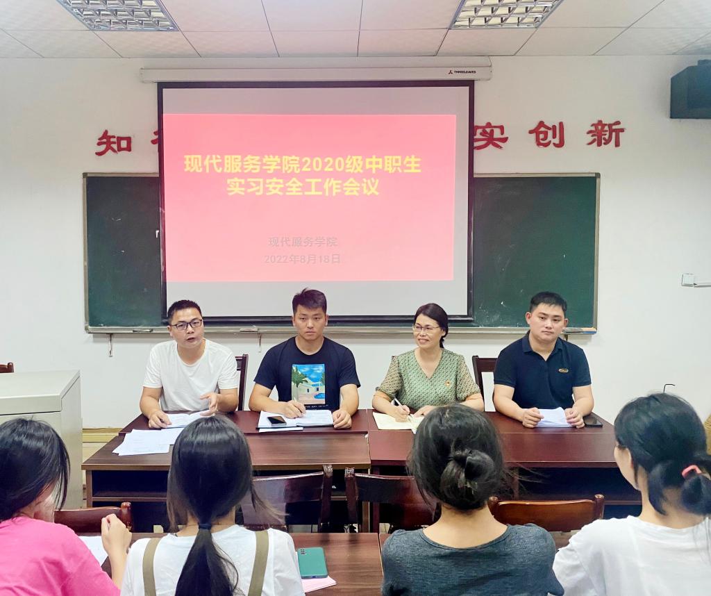 【现代服务学院郭鹏报道】为切实做好2020级中职学生的实习工作,强化学生实习安全意识,恪守实习责任理念,8月18日晚上,现代服务学院在五楼多媒体教室,召开2020级中职学生实习安全教育会。会议由分管学生工作负责人郭鹏主持,党支部书记欧阳小缨出席会议,全体2020级班主任及实习学生参加。