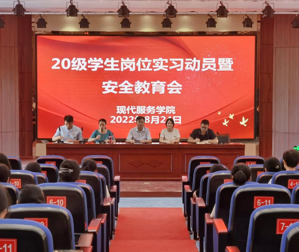【现代服务学院郭鹏报道】8月24日下午,现代服务学院在图书馆二楼报告大厅召开20级学生外出实习动员大会暨安全教育会议。出席会议的有分院院长阮和平、党支部书记欧阳小缨、教学工作负责人江敏、学生工作负责人郭鹏、学生科长林亮亮、就业干事敖敏军、全体班主任及2020级实习学生,会议由郭鹏主持。