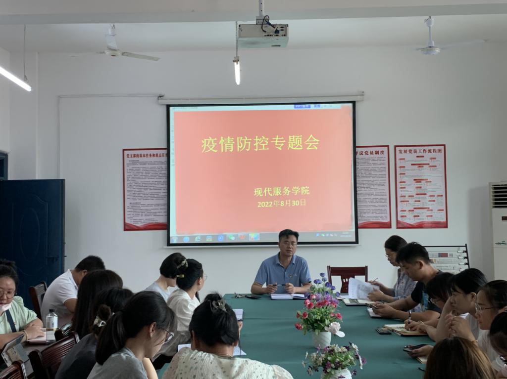 【现代服务学院周佳雪报道】8月30日,现代服务学院在老三教党员活动室召开疫情防控专题会。会议由分院院长阮和平主持。
