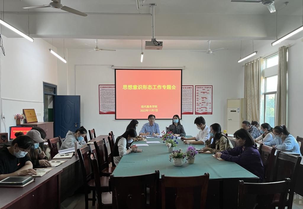 【现代服务学院廖斐报道】为进一步做好高校意识形态工作,近日,现代服务学院召开意识形态工作专题会。会议由党支部书记欧阳小缨主持,分院全体教职工参加会议。