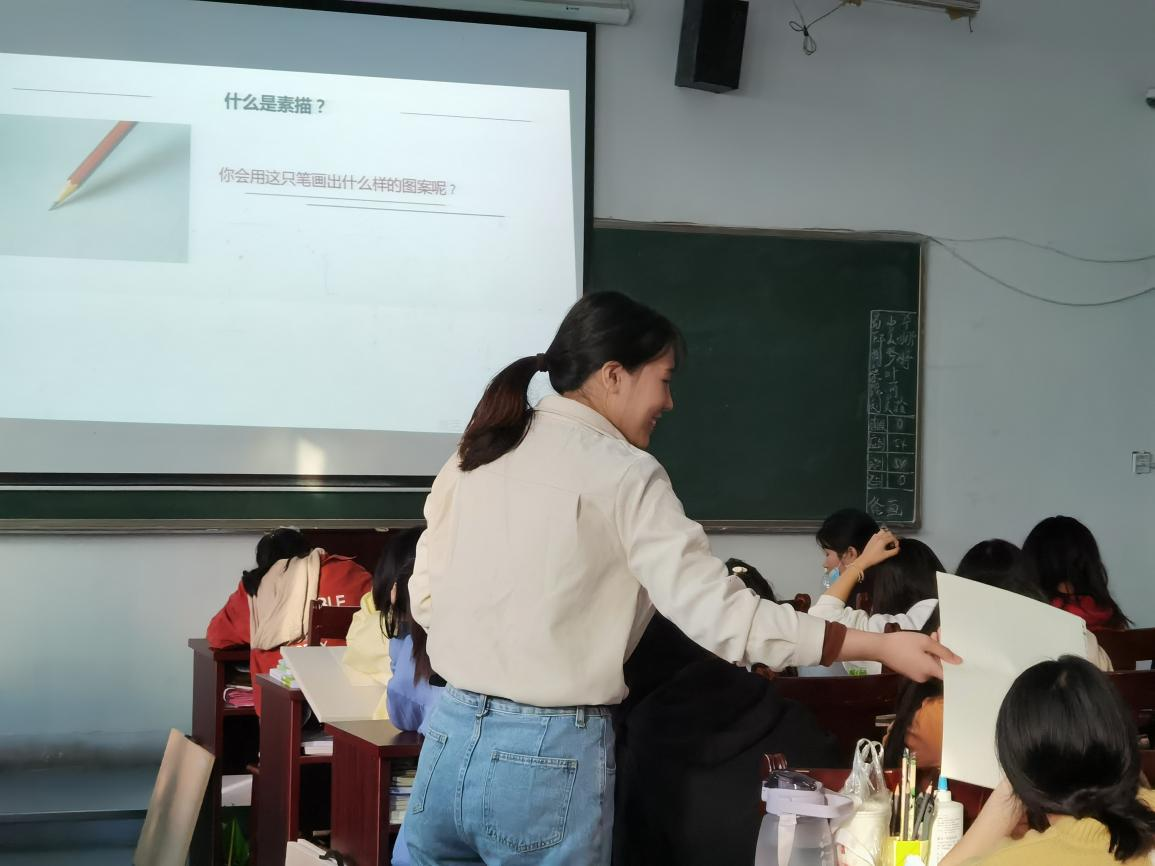 课堂上,郭诗琪老师通过绘画游戏引出素描的概念,帮助学生更好地理解素描的特点与要求,利用错位照片引发学生对于空间概念的思考,激发学生的学习兴趣;再从常见的生活场景入手解释透视规律,由生活场景引到绘画场景,层层深入,使学生逐步掌握绘画透视知识。以名句“绝望的颜色越浓厚,就越会产生耀眼的希望之光”,教育学生培养面对绝境不抛弃,不放弃的坚毅品质,同时以此带入物体反光知识。学生学习兴趣浓烈,课堂气氛热烈。