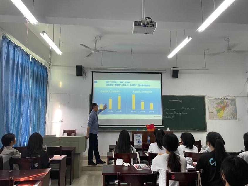 授课的过程中,阮和平用中外疫情防控中报告病例、死亡病例的强烈对比,让同学们更形象更生动地认识到中国特色社会主义的制度优势和以人民为中心的价值追求。面对当前新一轮严峻的疫情形势,他说道:“同学们应要简单生活、两点一线,落实好个人防控责任,坚定信心、相互理解、互相扶持,用实际行动体现江冶学子的责任与担当,共同筑牢校园防控的安全屏障。”