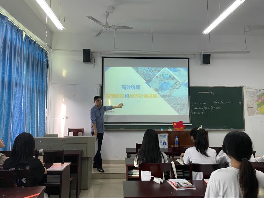 【现代服务学院周明霞报道】2022年11月11日上午,在老三教406教室,现代服务学院阮和平院长为21级婴幼儿托育服务与管理(6)班学生讲授题为“高校统筹疫情防控和经济社会发展”的形势与政策课。