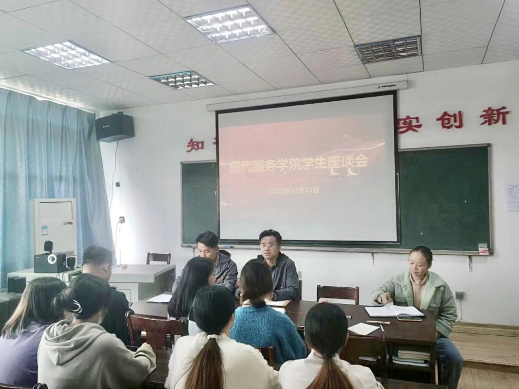 【现代服务学院郭鹏报道】11月21日下午,现代服务学院在北校区第三教学楼503多媒体教室召开学生座谈会。会议由分管学生工作的郭鹏老师主持。分院院长阮和平、党支部书记欧阳小缨出席了会议。