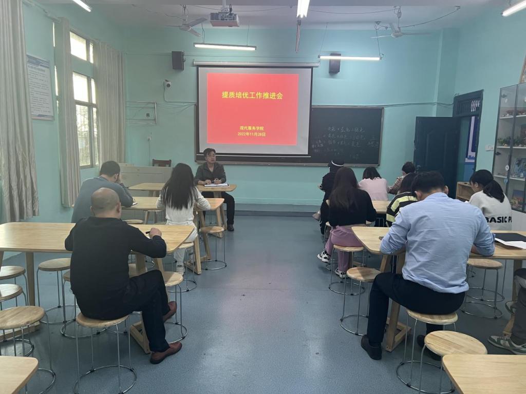 【现代服务学院肖倩芸报道】2022年11月28日,现代服务学院在老三教104教室召开提质培优工作推进会。会议由分院院长阮和平主持,分院教研室主任、提质培优项目负责人参加会议。