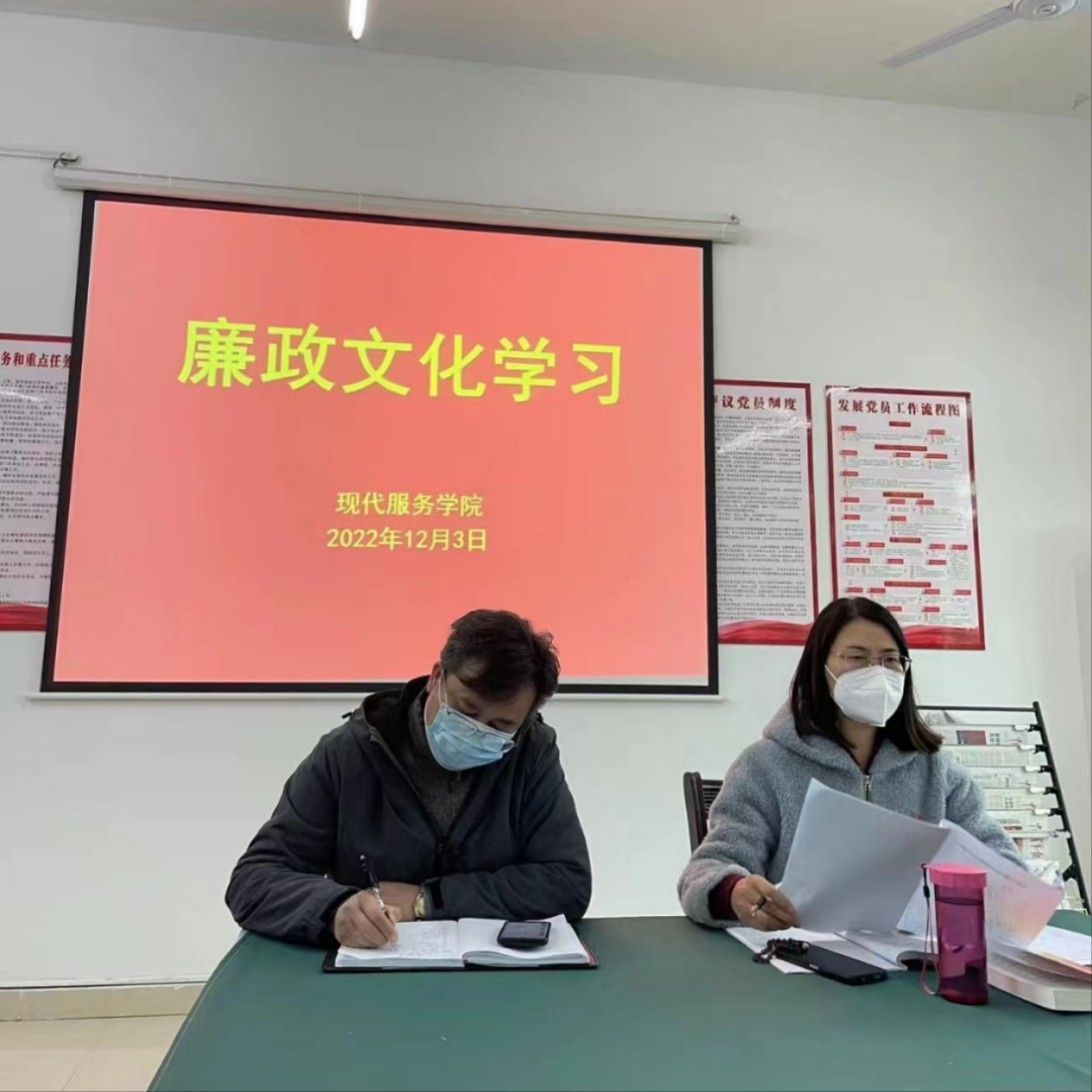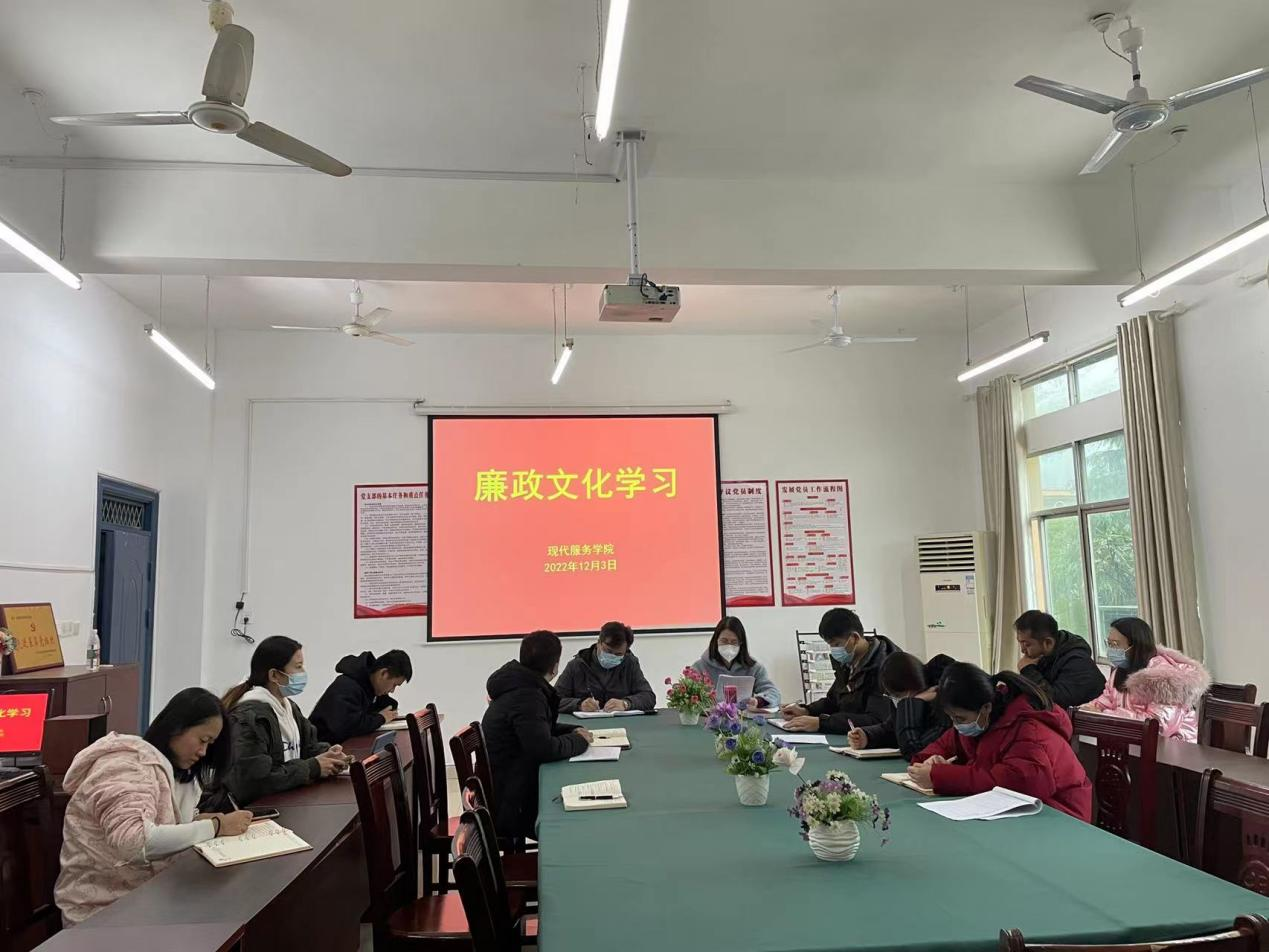 【现代服务周明霞报道】12月3日下午,现代服务学院在党员活动室开展了“加强廉政建设,弘扬清正廉洁”主题教育活动。会议由党支部书记欧阳小缨主持,全体在校教职工参加。
