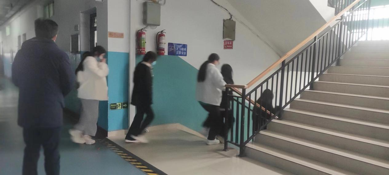 随后,阮和平宣布演练开始。警报声骤然响起,全楼学生在老师引导下迅速撤出教室,从安全通道口撤离。同学们一个个表情严肃,用手捂着口鼻,腰背半弯着下楼,有序地从通道口撤离“火灾”现场。楼内、撤离点的老师们按照消防演练方案疏散学生,确保楼内学生的安全,避免慌乱中出现拥挤踩踏事件。同学们全部撤离后老师们再陆续撤离教学楼。离开教学楼后,同学们按预先安排的位置整理集合完毕。