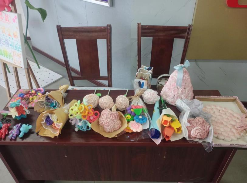 在3月8日国际劳动妇女节当天,学校图书馆一楼大厅充满着节日的喜庆,同学们为女教师准备了纯手工大鲜花、精美手工礼品等作为“三八妇女节”的爱心礼物。