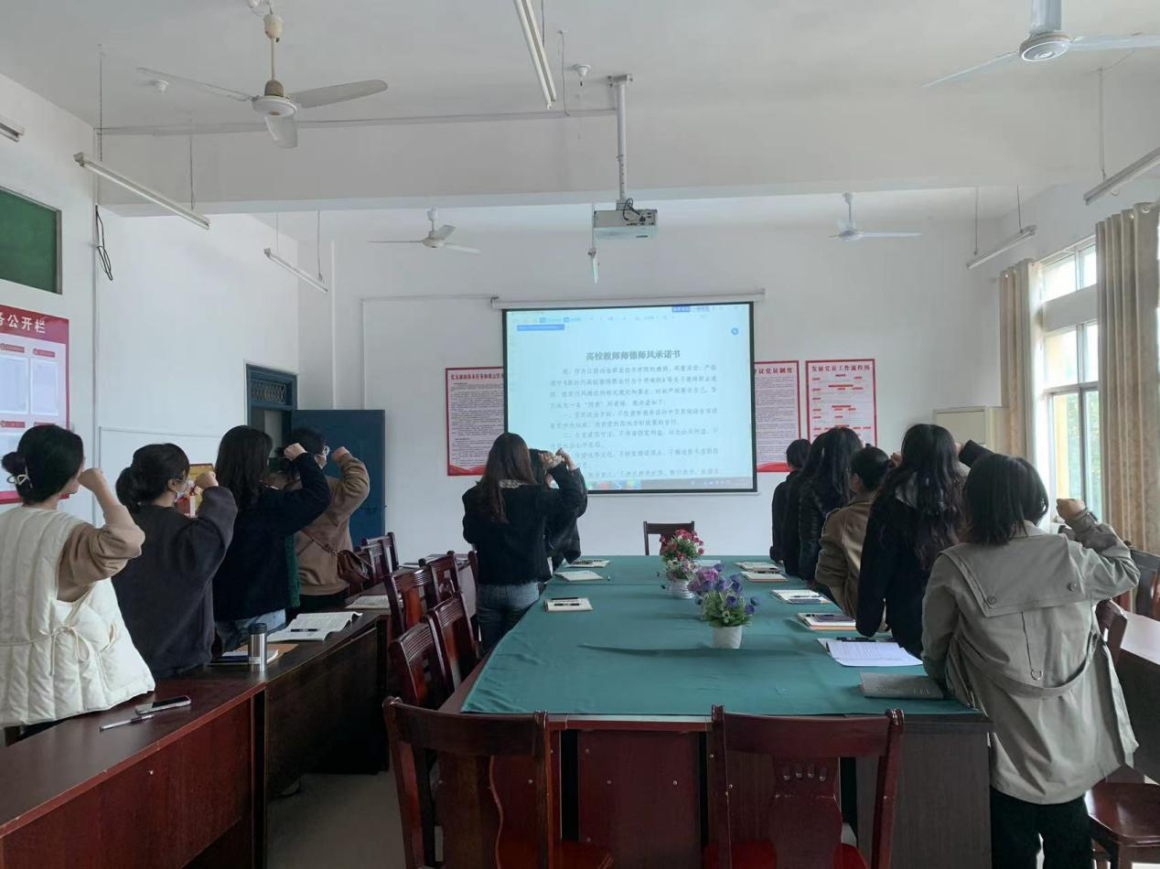专题会分为三个部分:首先,由万文英老师带领全体教师进行宣誓,同时签订高校教师师德师风承诺书。通过承诺书的签订,教师们深刻认识到所承担的职责使命,进一步增强了行为规范意识。
