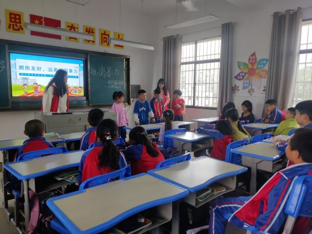 首先由入党积极分子廖雨薇以案例导入的方式向小朋友们讲授心理健康知识。她讲解到:要拥抱友谊,远离暴力,做健康的主人。她解释了什么是校园暴力,以及发生校园暴力后应如何保护自己。她还告诉小朋友们,要在生活中远离暴力伤害,不做施暴者。
