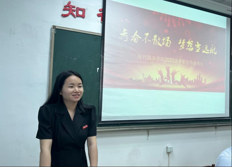 【现代服务学院赵令弘报道】以青春之热血,奔赴理想中的未来,毕业季的校园弥漫温暖与感动。5月30日,现代服务学院2023届中职同学们迎来了属于她们在母校的最后一次聚会——“青春不散场,梦想当远航”毕业典礼。本次毕业典礼在北校区老三教503举行,由现代服务学院副院长郭鹏主持。