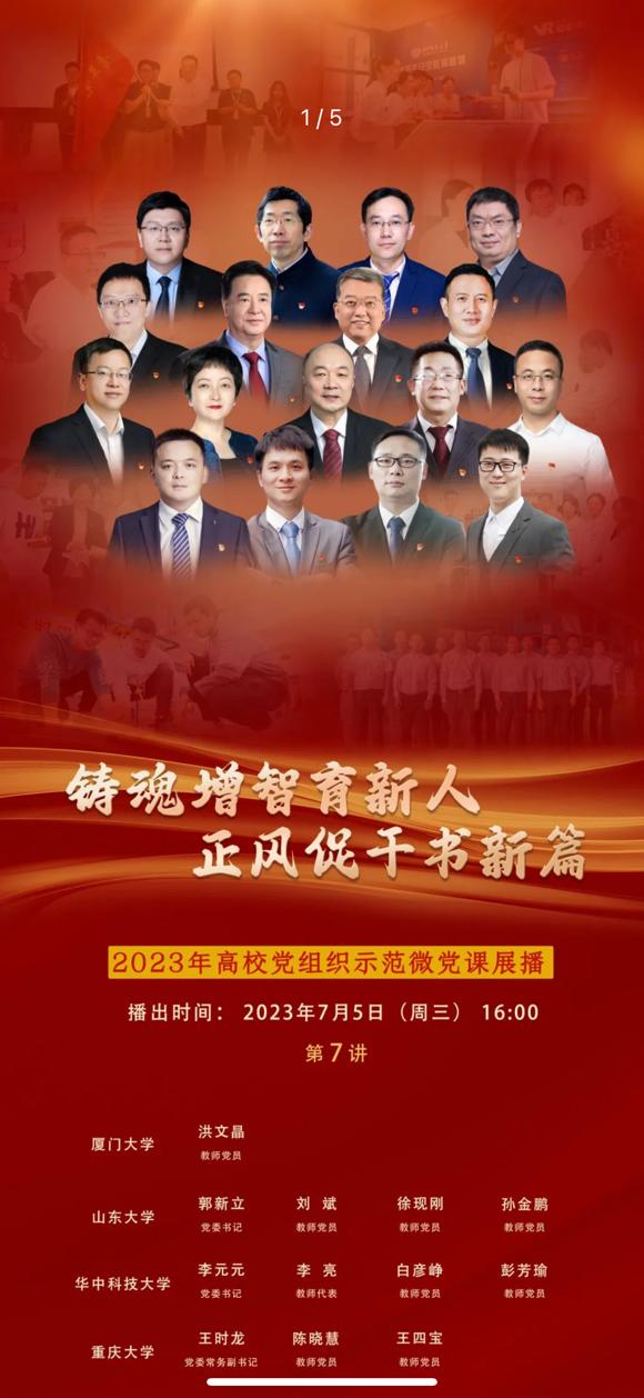 本次微党课内容由厦门大学、山东大学、华中科技大学、重庆大学、西南交通大学五校开讲,以“铸魂增智育新人、正风促干书新篇”为主题,全面展现教育系统学习贯彻习近平新时代中国特色社会主义思想主题教育突出成果,展现高校师生在新时代新征程中的良好精神风貌,充分发挥高校先进基层党组织和先锋模范人物的示范带动作用。