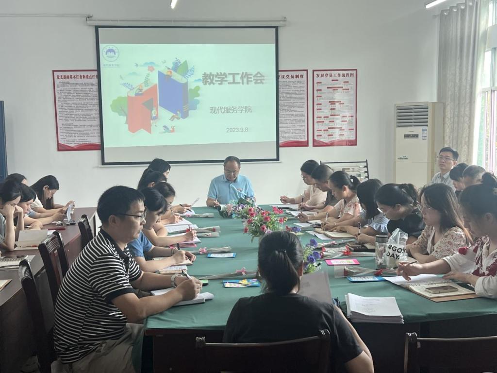 【现代服务学院万文英报道】2023年9月8日,现代服务学院在自强楼党员活动室召开教学工作会,安排工作。校领导彭全出席会议,分院副院长江敏主持,全体教职工参加。