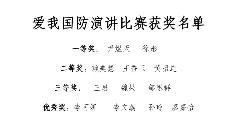 经过激烈的角逐,最终评出一等奖两名、二等奖三名、三等奖三名、优秀奖四名。评委老师徐卉对本次活动进行总结。她首先感谢各位选手带来的精彩演讲,让在场的每一个人接受了精神的洗礼,汲取了奋进的力量,厚植了爱国情怀。其次,她指出,演讲要紧扣主题,透彻阐述问题核心,深入了解了该主题的重要性和现实意义,内容要真实生动,语言要规范简洁,表达要流畅自然,感情要丰富饱满,形象要端庄大方,效果要情真意切、感染力强、催人奋进。最后,她结合今天的活动激励大家,树立崇高理想,努力学习,奋发图强,为强国防、保国家、护人民而努力奋斗!