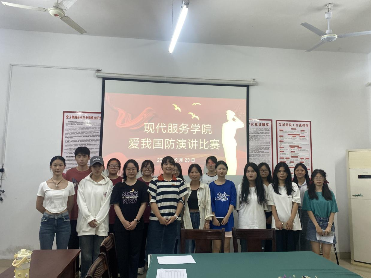 【现代服务学院徐卉报道】为深入学习贯彻落实习近平总书记关于加强全民国防教育的重要指示精神,营造全民参与国防教育的浓厚氛围,9月23日,现代服务学院在北校区三教党员活动室举办了“爱我国防”主题演讲大赛。