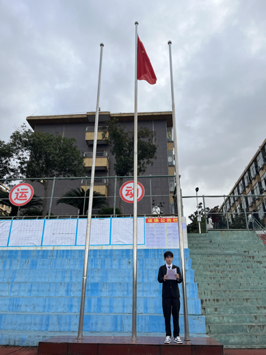 7:20分,升旗仪式正式开始。活动第一项,国旗护卫队目光坚定,昂首挺胸,迈着整齐有力的步伐,护送国旗入场。激昂的国歌响彻校园,五星红旗冉冉升起,全体师生庄严肃立,在场的每一位师生都向国旗行注目礼,深怀对祖国无限的热爱和崇高的敬意。