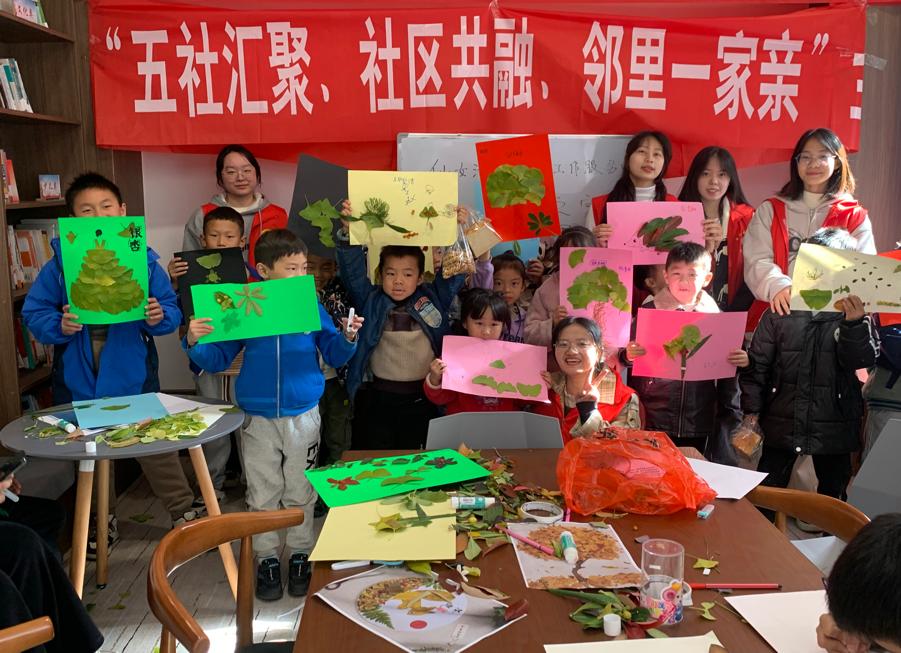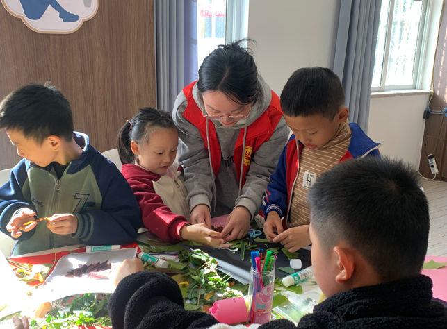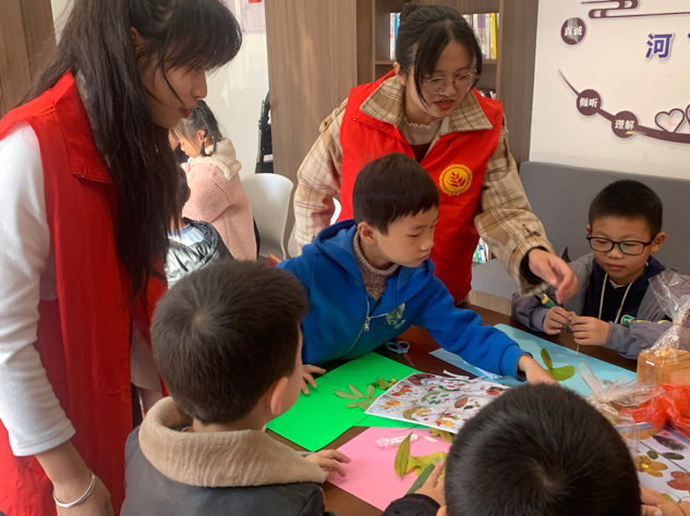 在爱幼活动中,大学生志愿者带着小朋友们来到幸福书屋,与他们一起游戏、学习。在手工课上,指导小朋友们用各种各样的树叶与卡纸,充分发挥自己的想象力,做出了许多美丽的作品并上台展示,小朋友们的脸上洋溢着纯真的笑容。