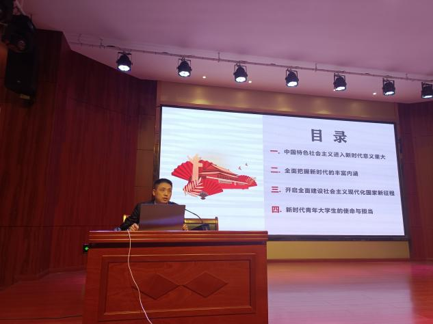 胡小平从“中国特色社会主义进入新时代意义重大”“全面把握新时代的丰富内涵”“开启全面建设社会主义现代化国家新征程”“新时代青年大学生的使命与担当”四个方面讲述《启新时代,赴新征程》。他指出,新时代青年大学生生逢强国时代,肩负强国使命,同学们从现在做起,从小事做起,做任何事情都要坚持,全心投入,不要轻易放弃。
