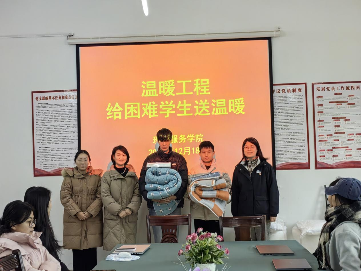 【现代服务学院周明霞报道】12月18日,现代服务学院在自强楼207教室开展了冬季慰问困难学生活动,为家庭经济困难的学生送去了一份温暖。分院党支部书记欧阳小缨、副院长江敏及专职辅导员周明霞参加了此次活动,