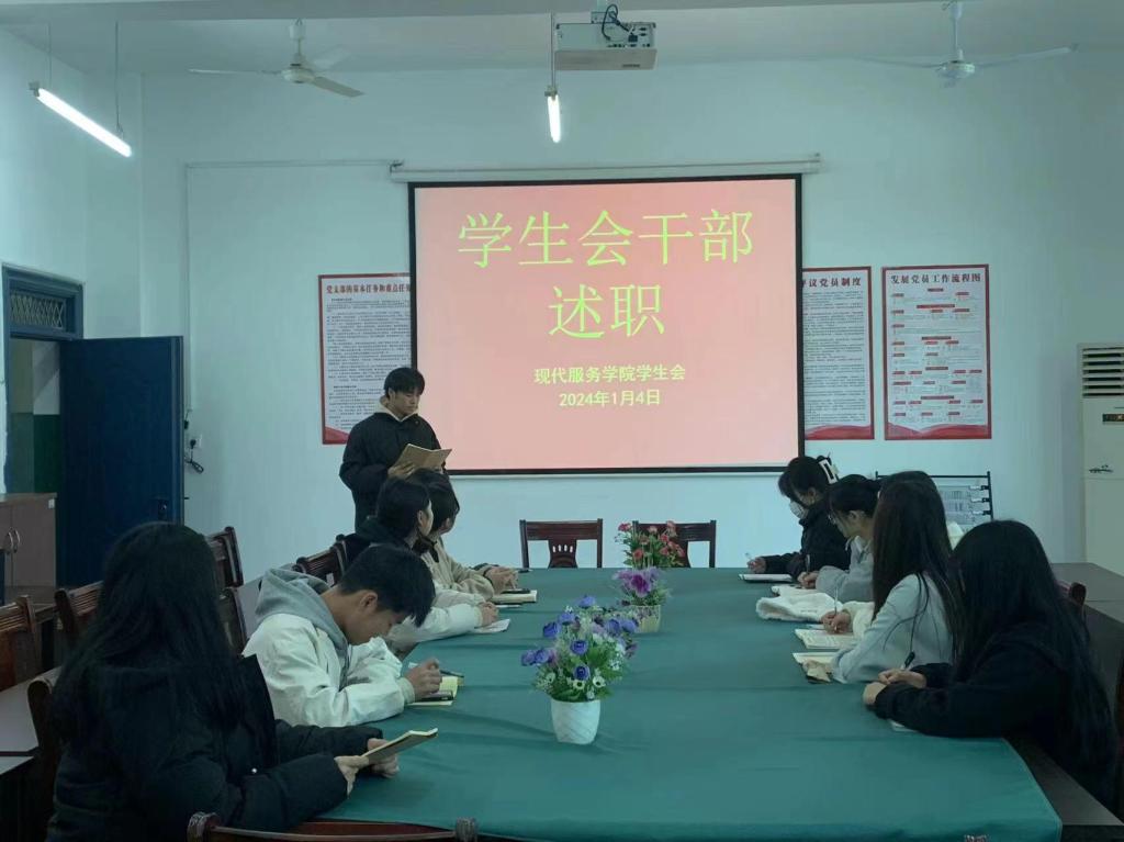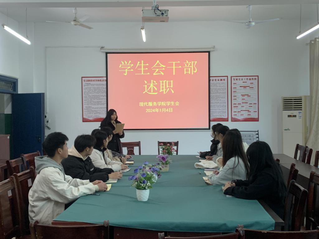 【现代服务学院徐卉报道】1月4日,现代服务学院学生会在老三教207党员活动室开展了学生干部述职评议会议。会议由学生会主席卢祎主持,全体学生会干部参加。