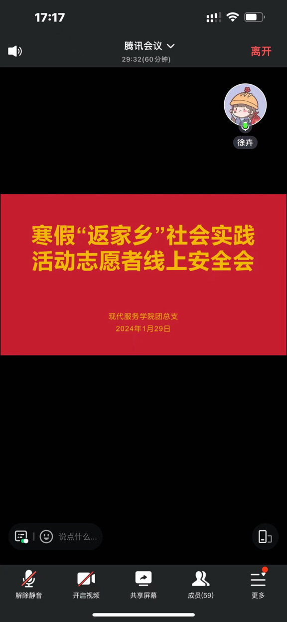 【现代服务学院徐卉报道】1月29日,现代服务学院团总支召开了寒假“返家乡”社会实践线上安全培训会。本次会议以“隐患处处有,安全时时记”为主题,重点讲解了志愿者在参与志愿服务时的安全问题。