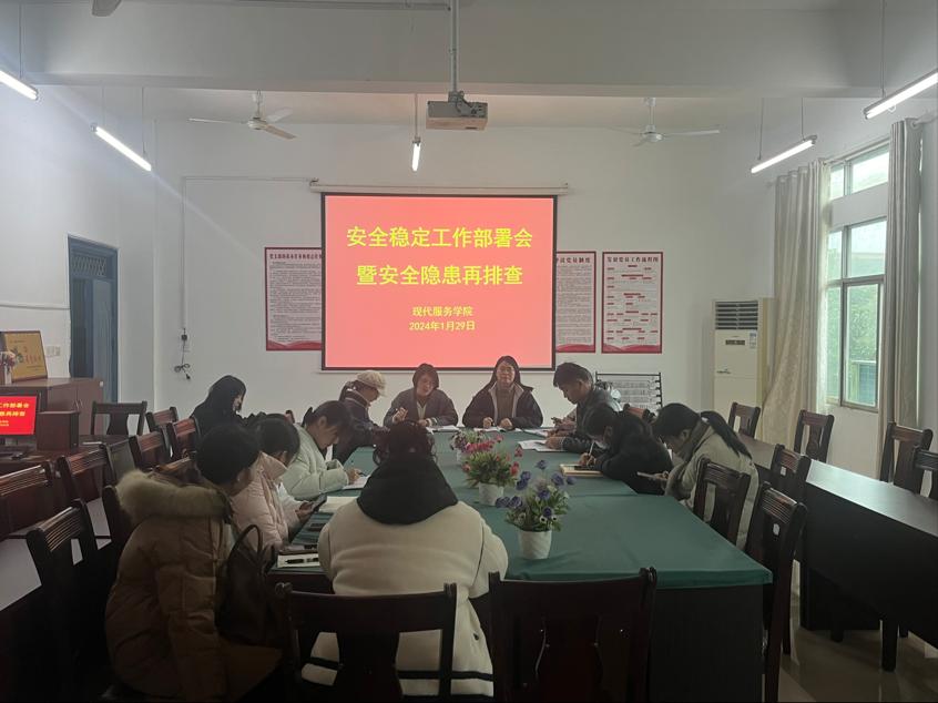 【现代服务学院徐卉报道】为进一步加强校园安全防范工作,1月29日,现代服务学院组织全体教职工召开安全稳定工作部署会,并对校园安全隐患进行再排查再整治。