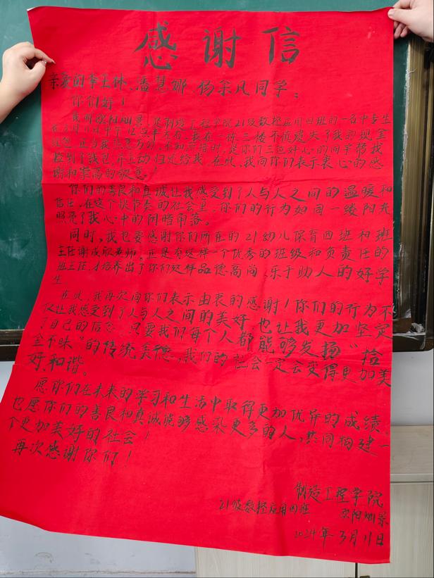 收到失而复得的红包,同学很激动,连声说,谢谢,谢谢!谢谢现代服务学院的老师,谢谢这三位女同学。3月11日,失主同学在杜院长的陪同下,来到现代服务学院保育4班,向三位女生当面致谢,并送上了一封感谢信。