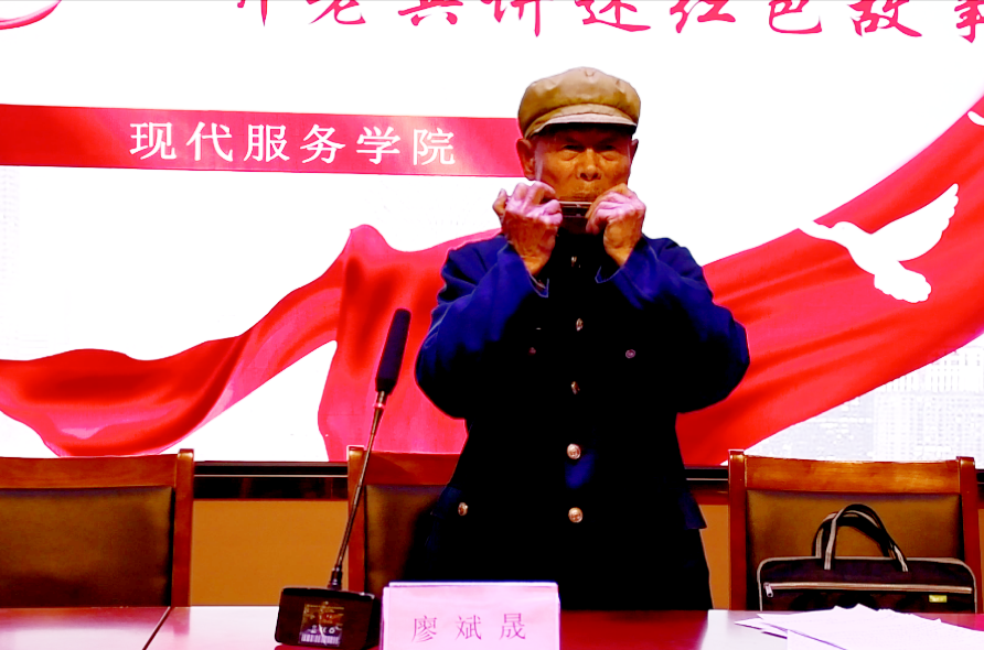 在分享的最后,廖老缓缓站起,以军姿站立,唱起激昂的红歌。全场师生都被这深情的歌声所感染,纷纷拍手伴奏。廖老还吹响了手中的口琴,优美的旋律飘荡在报告大厅的每一个角落。