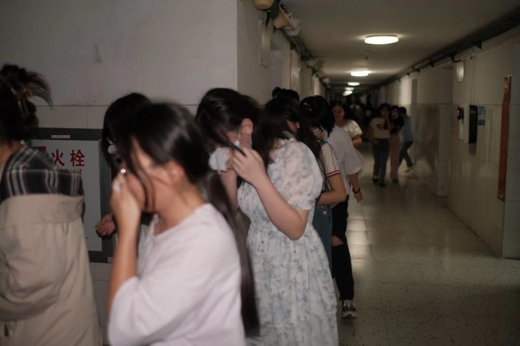 演练开始前,分院进行了周密的准备和安排,得到了学校保卫处的鼎力支持,确保演练过程的安全和有序。随着警报声骤然响起,原本宁静的宿舍楼瞬间变得紧张起来。宿舍楼内的学生们迅速按照预案进行疏散,纷纷从宿舍内冲出。她们手持湿毛巾捂住口鼻,低头弯腰快速前行,紧张而有序地按照预定路线向楼外疏散。在楼梯口、走廊等关键位置,师生志愿者们迅速到位,指引学生们有序撤离,确保每个人都能够安全到达指定集合点。
