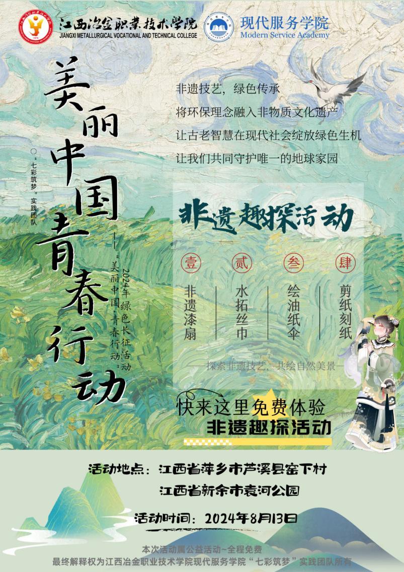 【现代服务学院徐卉报道】8月13日,现代服务学院“七彩筑梦”实践团队以“非遗之光,绿动未来”为主题,在萍乡市芦溪县窑下村、新余市袁河公园同时开展了一系列非遗文化宣传活动。团队成员结合自身专业优势,精心策划了非遗漆扇制作、水拓丝巾创作、绘油纸伞以及剪纸刻纸等丰富多彩的活动内容,巧妙地将环保理念融入其中,为绿色长征的壮丽画卷添上了浓墨重彩的一笔。