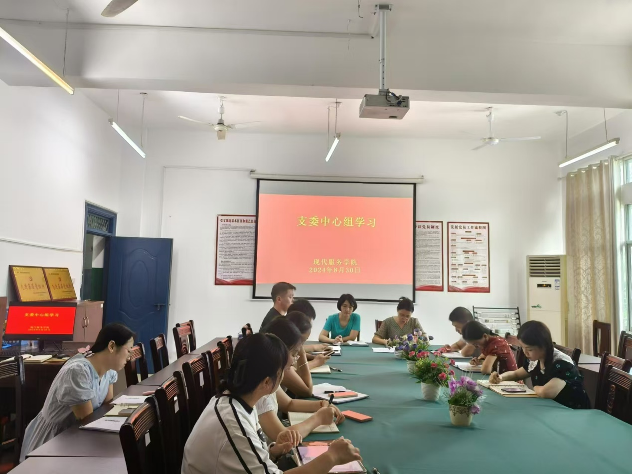 【现代服务学院周明霞报道】2024年8月30日,现代服务学院党支部在北校区自强楼党员活动室召开了8月份理论学习中心组学习,为分院发展注入新的思想动力。