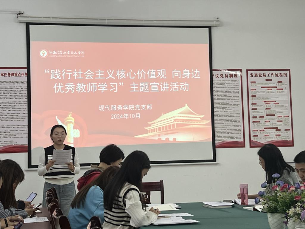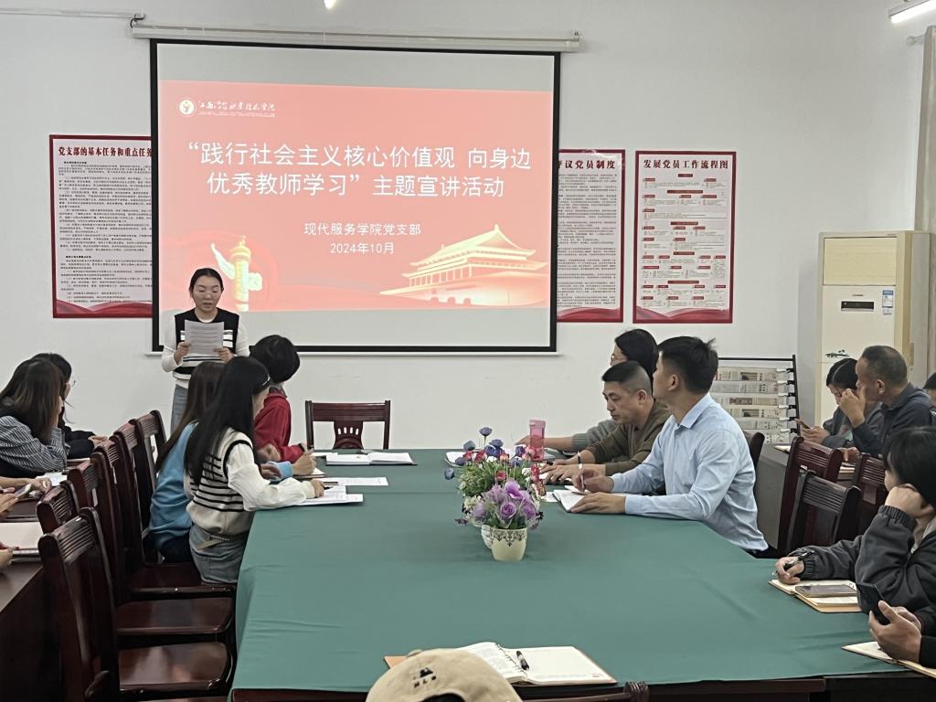 【现代服务学院周明霞报道】2024年10月23日,现代服务学院开展了优秀辅导员事迹交流分享会。分享会由分院党支部书记欧阳小缨主持,分院全体教师参加。辅导员周明霞老师作为优秀代表进行了事迹分享。