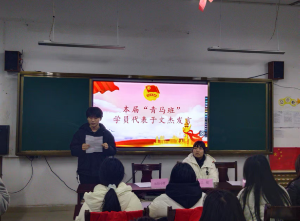 开班仪式在庄严的国歌声中正式拉开帷幕。全体青马班学员起立,齐唱国歌,现场气氛庄重而热烈。上届优秀学员代表汪巧巧同学上台发言。她回顾了自己的学习经历,分享了成长感悟,鼓励新学员们珍惜机会,努力提升思想政治素质和综合能力。于文杰同学代表本期青马班学员发言。他表达了对“青马工程”的憧憬和决心,承诺将以饱满的热情和认真的态度投入到学习中,不断提升自己的理论水平和实践能力。