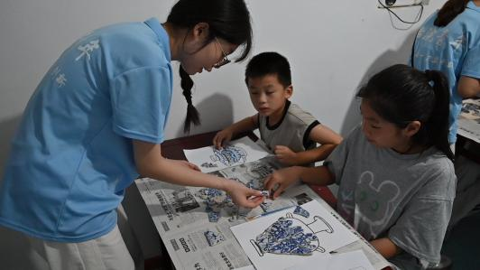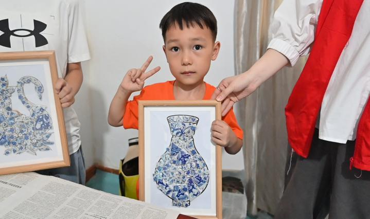 队员们蹲在孩子身边,把在景德镇学到的“补瓷”技巧化繁为简:“边缘要像老匠人补碗那样对齐,才会好看。”当孩子们举着作品相互展示时,那些带着稚拙的青花贴画里,既有景德镇千年瓷艺的基因,又生长出独属于乡村的童真创意。