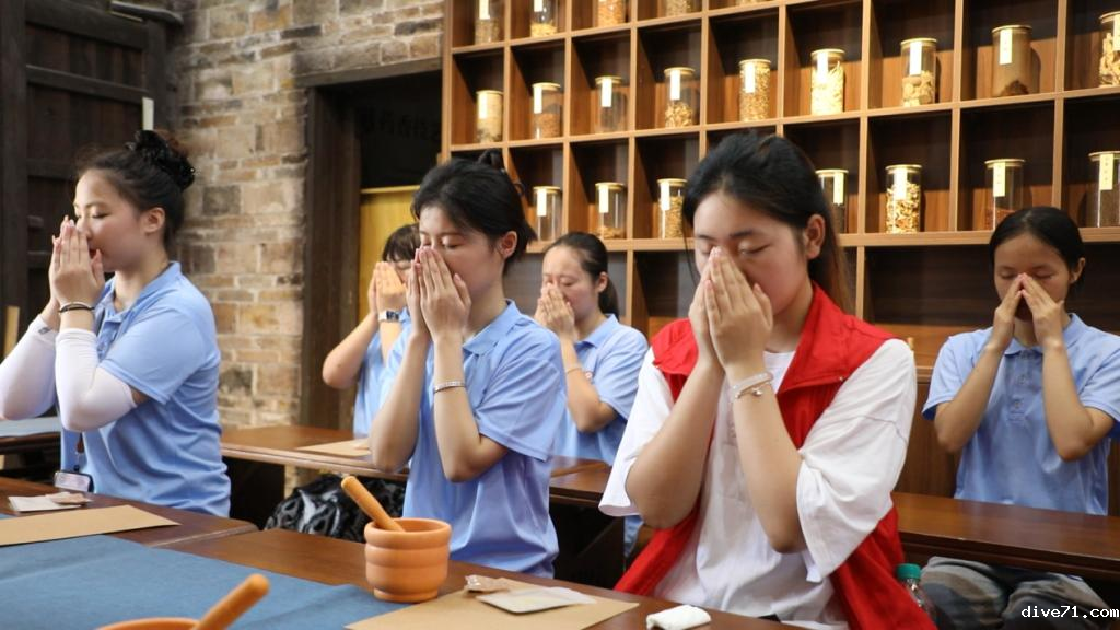 香牌制作环节,推普与非遗的融合达到极致。“沉香三钱、檀香两钱”,传承人说罢,学子们齐声重复剂量单位的普通话读音;研磨药材时,有人念叨“碾(niǎn)得细如面粉”,边纠正发音边调整力度;和香时,跟着传承人念“顺时针搅拌百次”,在语言节奏中掌握古法技巧。