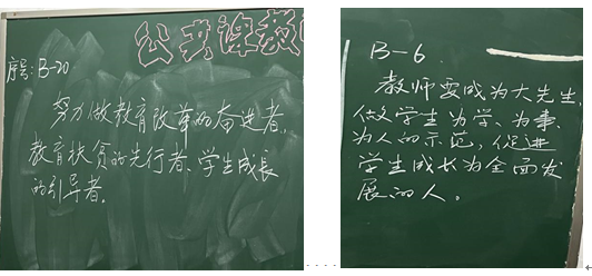 比赛现场,老师们精神饱满,一笔一画认真书写。不到10分钟,一幅幅富有个性的书法作品在黑板上呈现出来,有的清秀隽美,有的遒劲有力,有的稳重端庄,有的飘逸洒脱,一笔一划,一勾一折,无不体现着书写者的用心和才情。