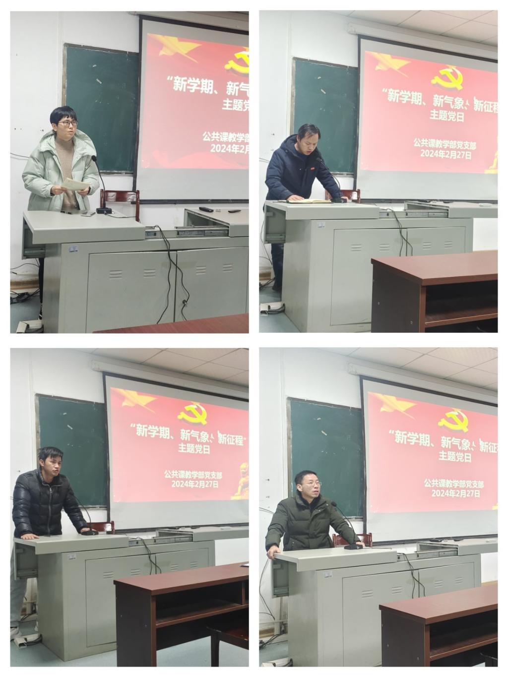 【公共课教学部党支部雷小花报道】2月27日上午,公共课教学部党支部在明辨楼312室开展“新学期、新气象、新征程”主题党日活动。党支部书记陈耀新主持会议,公共课教学部全体党员参加活动。