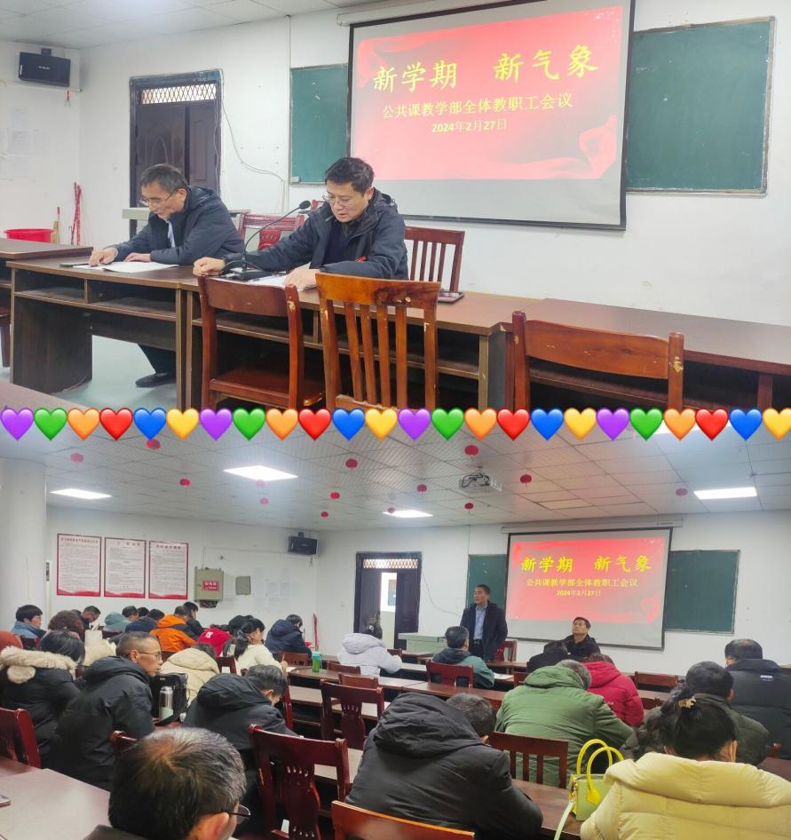 公共课教学部部长戴宝富讲话。他对部门2023年工作的亮点和不足进行了小结和反思,对如何干好2024年工作做了部署。他要求全体教师,要认真做好新学期教学准备工作,在完成教学基本工作的前提下,把精力更多的投入到内涵建设和高质量工作中去。