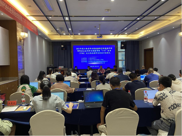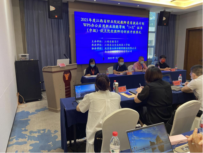 2022年7月25日上午,在湖南长沙延年福润酒店,2021年度江西省职业院校教师素质提高计划-WPS办公应用职业技能等级“1+X”证书(中级)试点院校教师培训班开班仪式顺利举行。学院1+X推进办主任、继续教育中心主任徐裕和、金山办公软件股份有限公司师资培训部部长渠畅、北京微金文化科技有限公司产品经理马琪、江西省中高职院校30名参训老师,以及何红梅等3位授课老师参加了开班典礼。