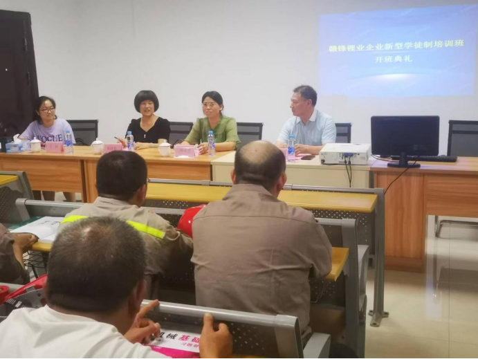 【继续教育中心敖瑾煜报道】2022年9月19日晚,在赣锋锂业万吨锂盐工厂员工培训室,学院举行了企业新型学徒制培训班开班典礼。新余高新区就业创业服务中心主要负责人谢金秀、赣锋锂业常务副总裁邓招男、学院继续教育中心主任徐裕和出席本次开班典礼。典礼由赣锋锂业人力资源部李零零主持。
