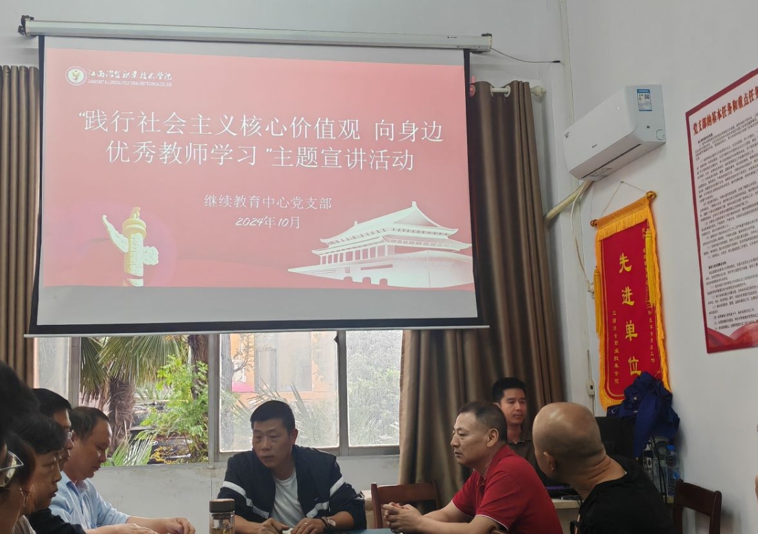 10月15日下午,继续教育中心在明辨楼115党员活动室开展“践行社会主义核心价值观,向身边优秀教师学习”主题宣讲活动。活动由继续教育中心副主任郭永飞主持,张洋老师主讲,中心全体成员参与。